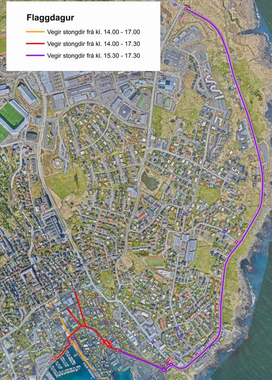 - Frá klokkan 15.30 til 17.30 er Áarvegur stongdur frá Vaglinum til Havnagøtu og víðari til rundkoyringina við Skansan. Vegurin Yviri við Strond er stongdur frá rundkoyringini til Hoyvíksvegin