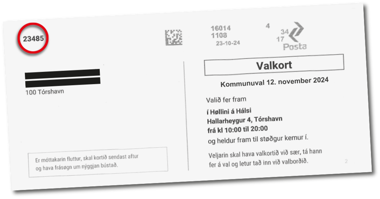 Á valkortinum sært tú, hvar tú skalt greiða tína atkvøðu. Tú fært valkortið sendandi í seinasta lagi tvær vikur áðrenn valdagin. Á kortinum niðanfyri sært tú, hvar øll valstøðini eru í kommununi: